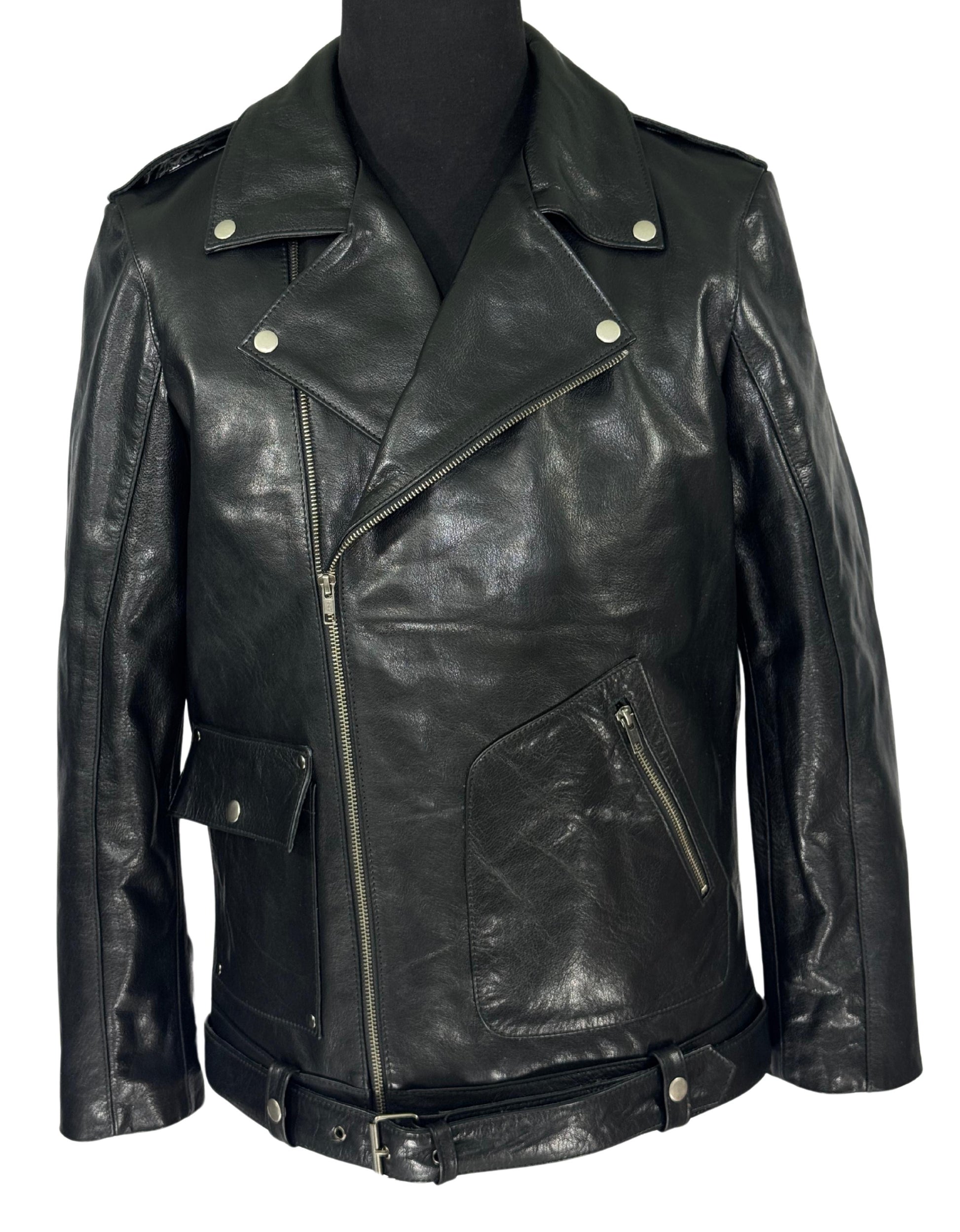 Double breasted with gunmetal zippers and snaps, belted with two pockets on front