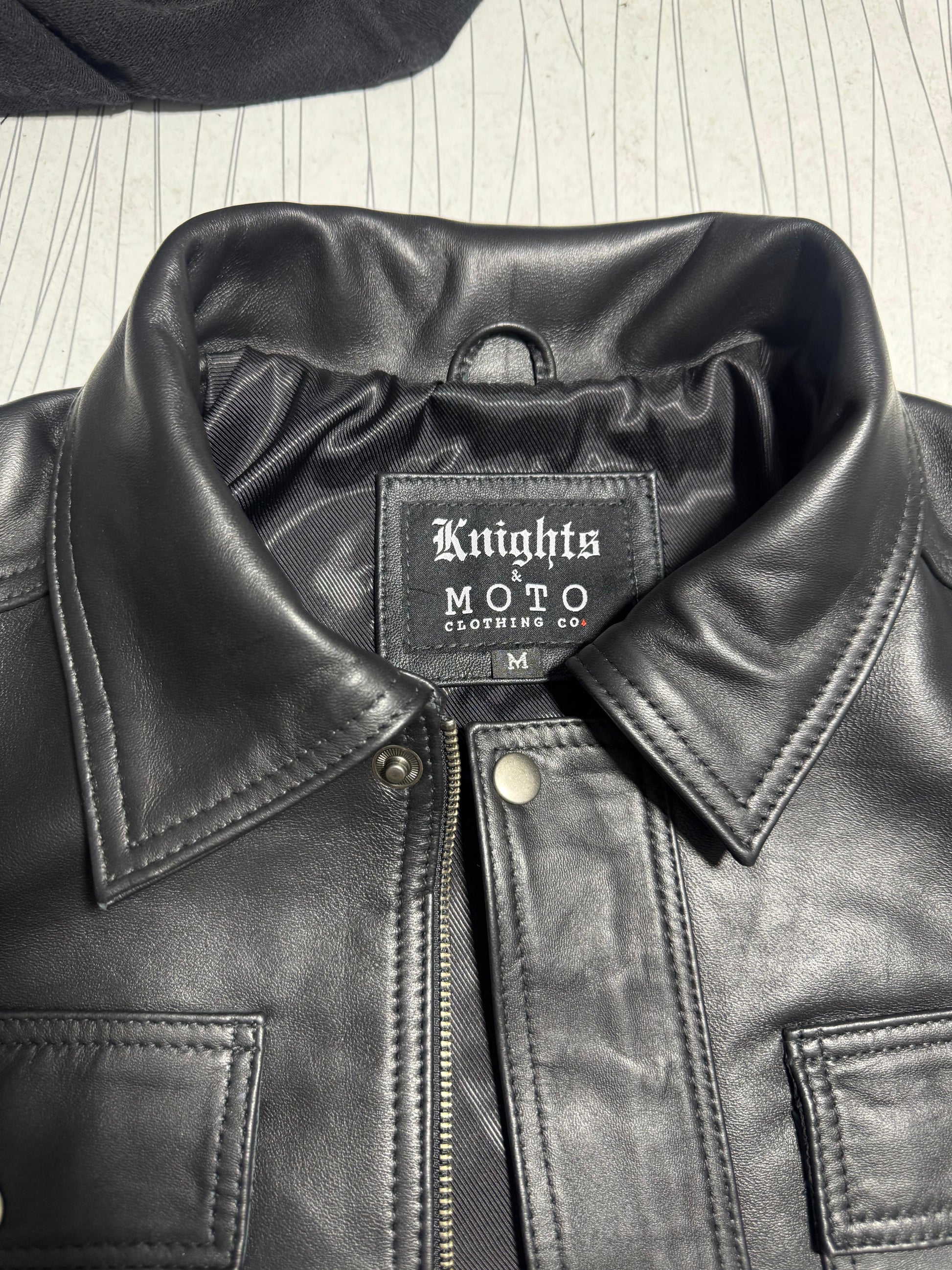 Fold collar, double breast pockets, side leather pockets, gunmetal snaps over zipper front